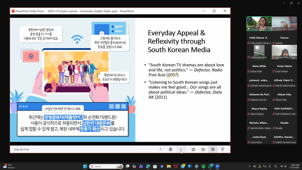 INAKOS bekerja sama dengan Prodi Bahasa dan Kebudayaan Korea UGM dan melalui pendanaan Hibah dari Korea Foundation mengadakan seri kuliah umum daring untuk kedua kalinya. Kuliah umum seri kedua ini diselenggarakan pada 21 November 2025 secara daring dengan narasumber Dr. Kim Jihye dari University of Melbourne yang membahas tentang “K-drama Under the Blanket : Hallyu and Everyday life in South Korea”. Selama kurang lebih satu jam, Dr. Kim Jihye memaparkan dengan bahasa pengantar bahasa Inggris, bagaimana gelombang budaya Korea Selatan modern masuk ke Korea Utara melalui drama Korea (K-Drama). K-Drama ini masuk dengan cara diselundupkan karena pemerintah Korea Utara memberlakukan larangan pemutaran konten-konten budaya dari Korea Selatan. Meskipun begitu, masih banyak rakyat Korea Utara yang menonton drama-drama Korea produksi Korea Selatan. Kuliah umum ini diikuti lebih dari 70 orang peserta dan dimoderatori oleh Alfiana Amrin Rosyadi, S.S, M.A, dosen Prodi Bahasa dan Kebudayaan Korea FIB UGM. Selama kuliah umum, peserta mendapatkan kesempatan untuk bertanya dan menjawab pertanyaan-pertanyaan yang diajukan oleh pemateri. Diharapkan kedepan, ada banyak kuliah umum dan kerja sama yang bisa dilakukan oleh INAKOS di masa mendatang.